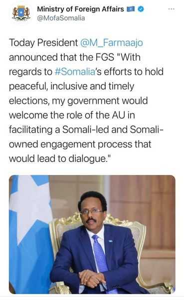 Qoraal ka soo baxay Wasaarada Arrimaha Dibbada Dowlada Federalka ayaa lagu sheegay in Madaxweynaha Waqtigiisu uu dhamaaday ee Farmaajo uu doonayo in Midowga Afrika dhexdhexaadin ka sameyo dowladda iyo saamilayda siyaasadda.