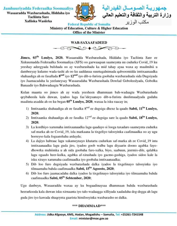 Wasiirka ayaa sheegay in ka dib markii Wadatashiyo kala duwan ay la qaateen qeybaha kala duwan bulshadda in ay isku raaceen in 11 bishaan la qaado Imtixaanka dugsiyadda Dhexe halka dugsiyadda Sare la qaado 18 Bishaan.