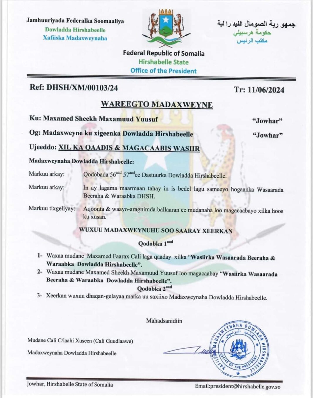 Wareegto ka soo baxday Xafiiska Madaxweynaha Dawlad goboleedka Hirshabeelle Cali Cabdullaahi Xuseen Guudlaawe ayaa xilka looga qaaday wasiirka wasaarada Beeraha iyo Waraabka ee Hirshabeelle Maxamed Cali Faarax Waxaana Xilka wasiirka wasaarada Beeeaha & Waraabka ee Dawlad goboleedka Hirshabeelle loo magacabaay Mudane Maxamed Sheekh Maxamuud Yusuf oo ah Aqoon yahan la soo shaqeeyay hay’adaha Samo Falka ee ka Hawlgala degaannada dawlad goboleedka Hirshabeelle.