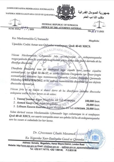 Xafiiska Xeer ilaalinta qaranka ee dowladda Soomaaliyeed ayaa qoraal uu soo saaray waxa uu amar ku bixiyay in la soo qabto sharcigana la horkeeno saddex ganacsao oo ku eedeysan dhoofinta dhuxusha.