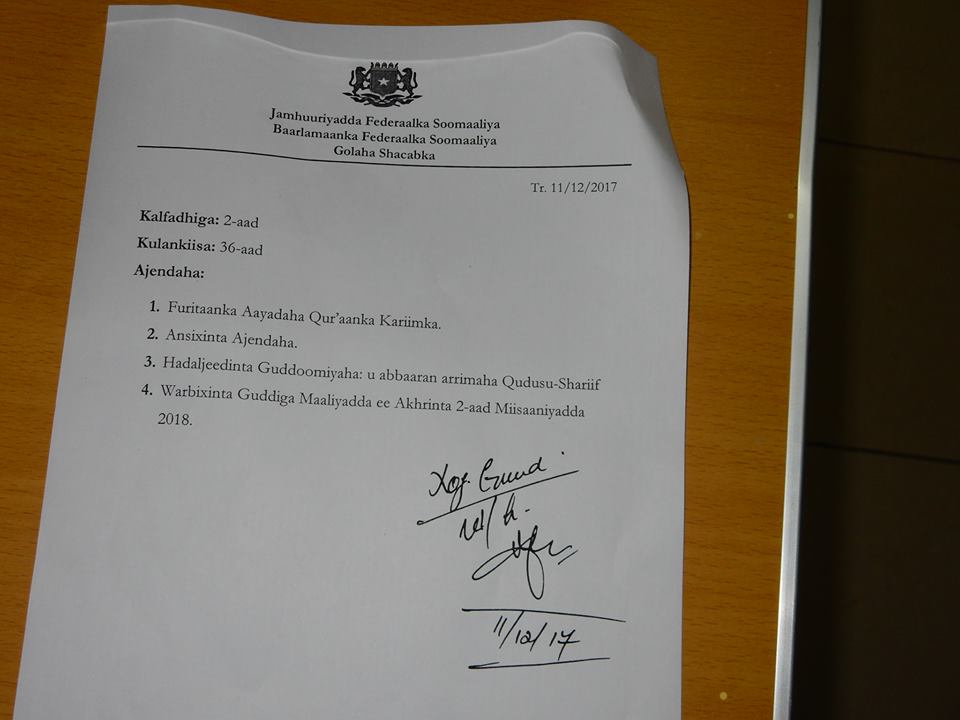 Kulanka Golaha shacabka Soomaaliya ayaa goordhow ka furmay magaalada Muqdisho waxaana ajendayaasha ay kala yihiin ka hadlidda Go’aanka Trump ee Quddus ugu aqoonsaday Caasimadda Maamulka Yuhuudda iyo ka doodidda Miisaaniyadda Sanadka soo socda ee 2018ka.