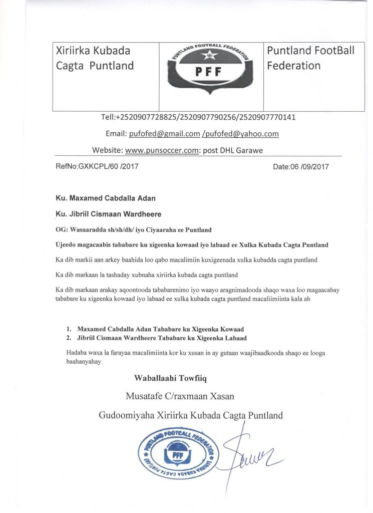 Xiriirka Kubadda Cagta Puntland oo Magacaabay Tababarayaal Kubadeed (Akhriso)