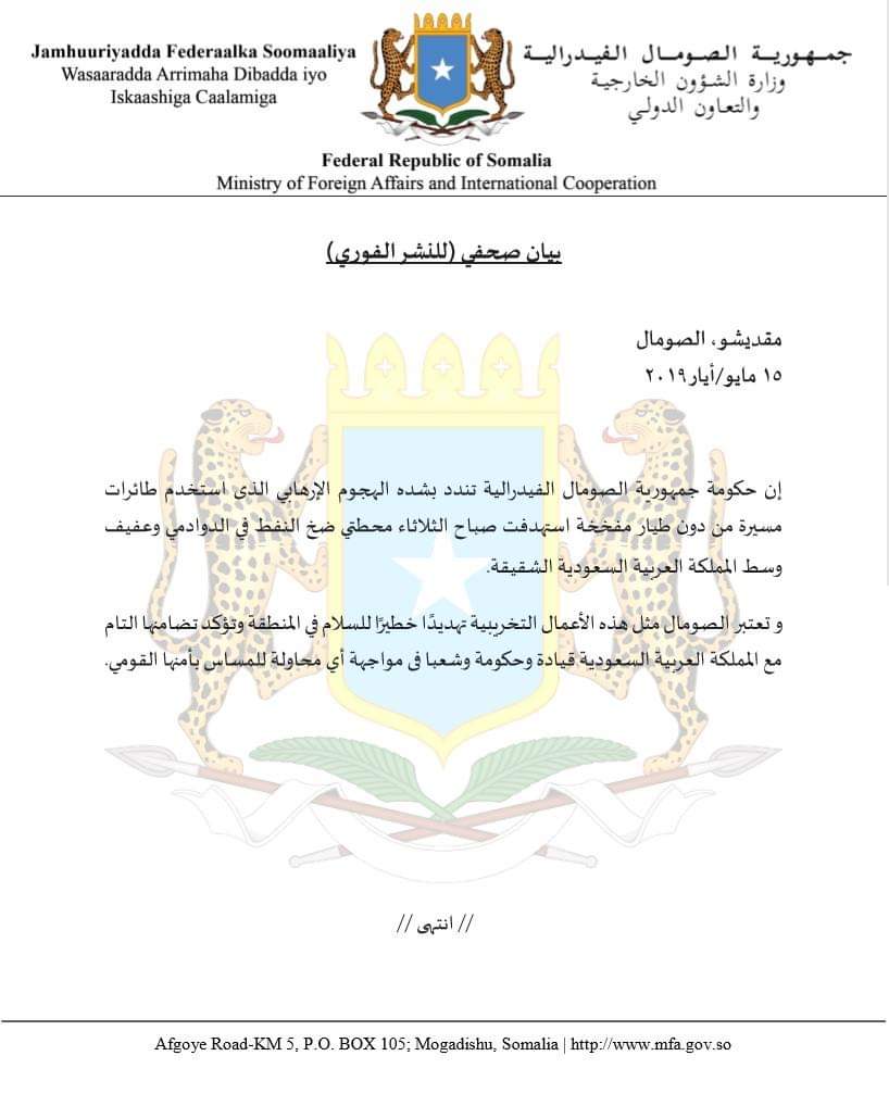 Soomaaliya waxa ay u aragtaa falalkaasi burburinta leh mid halis ku ah nabadgelyada gobolka, waxa ayna si dhammaystiran u garab taagan tahay Boqortooyada Sacuudi Carabiya hoggaankeeda, xukuumaddeeda iyo shacabkeeda si ay uga hortagaan iskuday waliba oo lagu waxyeeleynayo amniga qarankooda.