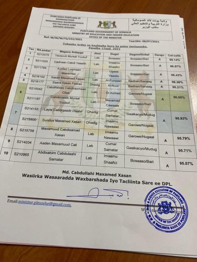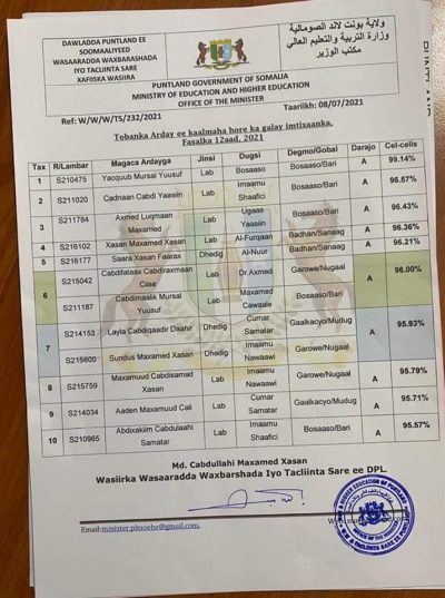 Wasaarada Waxbarashada Puntland ayaa shaacisay 10 Arday ee imtixaanka kaalinta ugu saraysa galay.